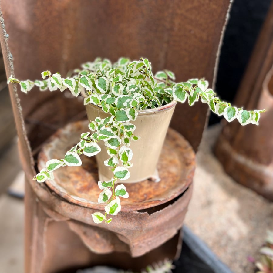 Ficus pumila ‘Belle Sunny’ är en charmig och dekorativ klättrande eller hängande växt med små, hjärtformade blad i grönt med gyllengula kanter. De tätt sittande bladen ger ett livfullt och färgstarkt intryck, och växtens växtsätt gör den lika vacker i ampel som i kruka där den får klättra eller breda ut sig. Den är perfekt för att skapa grönska och kontrast i hemmet året runt.
