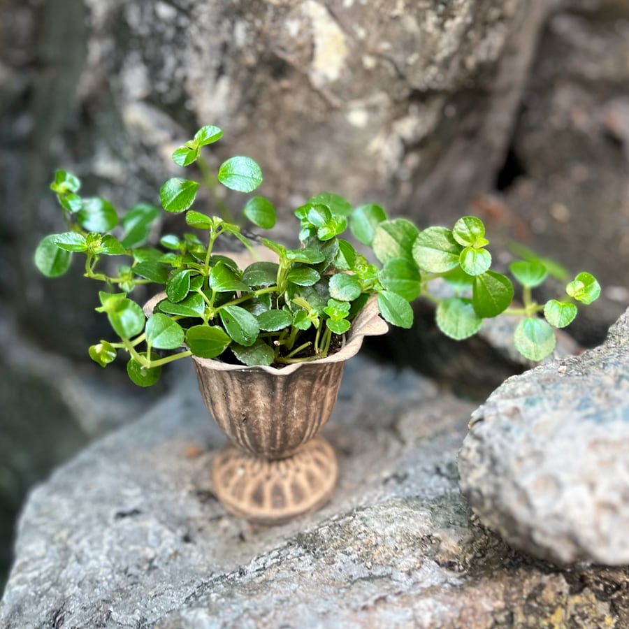 Pilea depressa är en charmig och lågväxande art som bildar täta mattor av små, rundade gröna blad. Rankorna växer mjukt hängande eller krypande, vilket gör den idealisk för ampel, hylla eller som marktäckare i större planteringar. Med sitt fräscha gröna bladverk ger den ett livfullt och mjukt intryck som passar lika bra ensam som i kombination med andra växter.